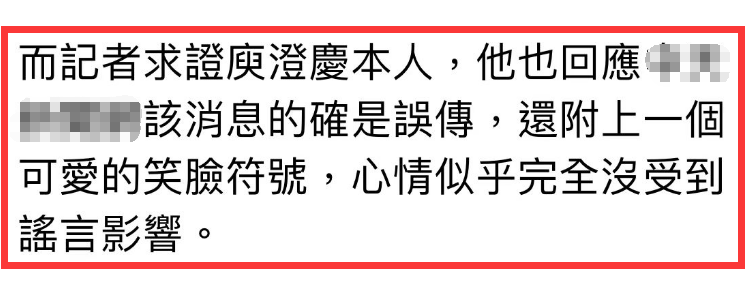 眼看着自己被无良媒体胡乱造谣,庾澄庆本人也亲自回应了,他表示该消息的确是误传,还附上了一个可爱的笑脸符号,心情似乎完全没有受到谣言影响。