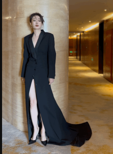 这条西装裙配上妆容真的可以用“霸气侧漏”来形容,不过也是高开叉和深V的设计,让整个造型看起来不会太厚重和古板,多了几分女性的性感和调皮。
