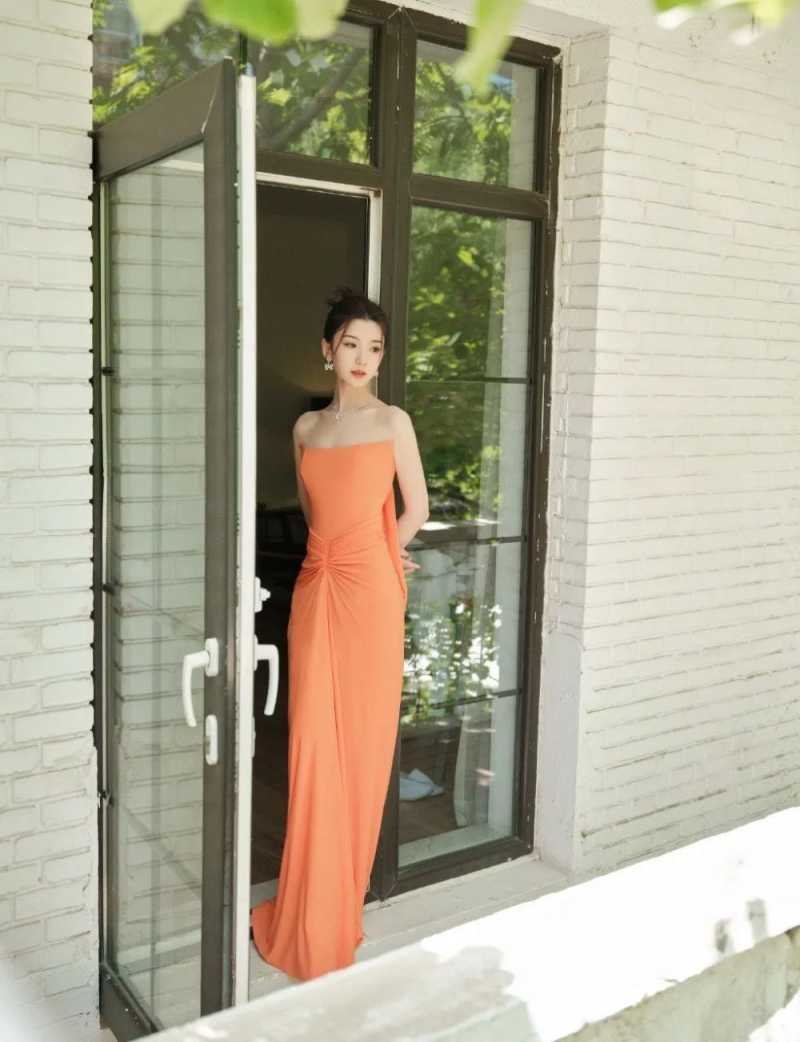 身材娇小的毛晓彤选择的依然是能修饰身材的抹胸直筒裙,这条裙子不但能修饰她好看的肩颈线条,收腰的设计也很巧妙,很有女人味。