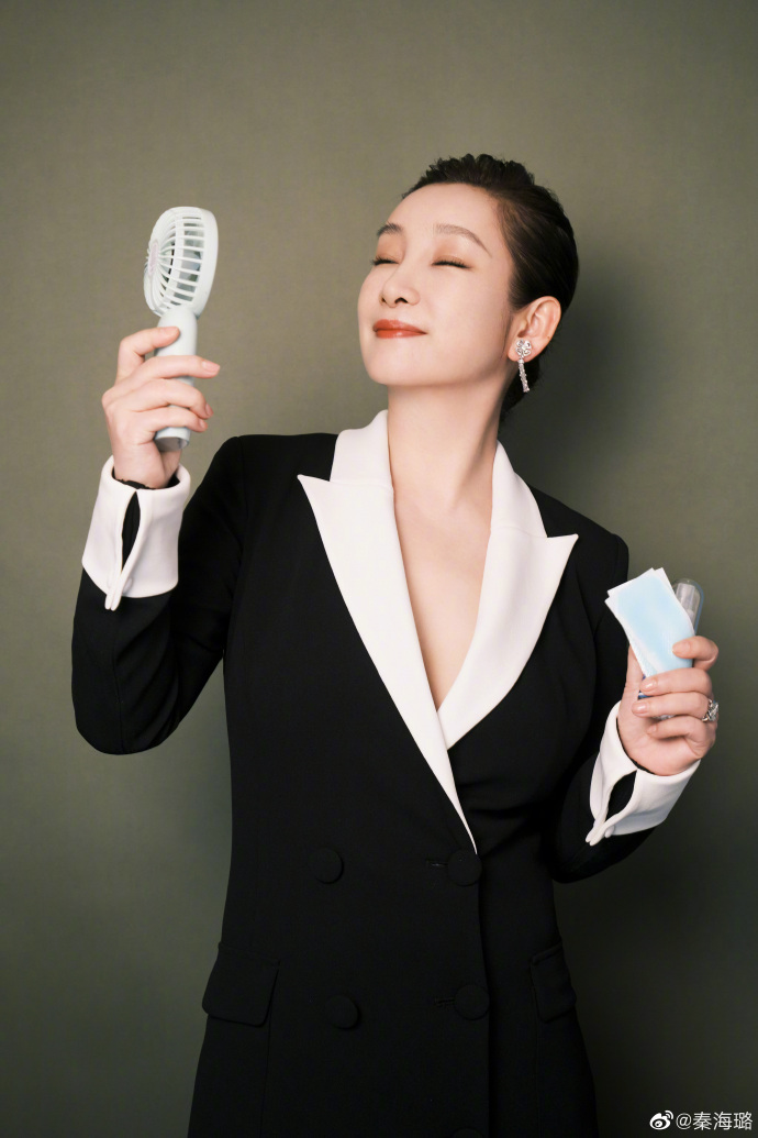 黑色这个经典的颜色也是很多女星红毯上的“必杀技”之一,秦海璐选择的是一套黑白西装裙装,设计和颜色十分简约也十分有气场,很符合秦海璐本人的气质。