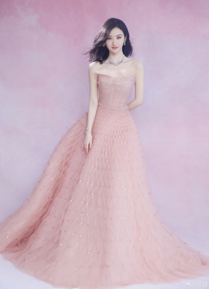 景甜和李沁一样选择了粉色裙子,不过景甜的礼服更加华丽,是一件抹胸带钻的A字裙。