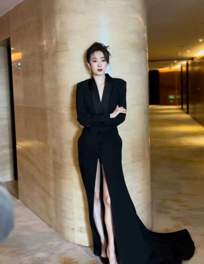 张小斐这次的造型和秦海璐的有几分相似,不过张小斐的西装裙是全黑的,整体的妆造也是偏“暗黑系”。