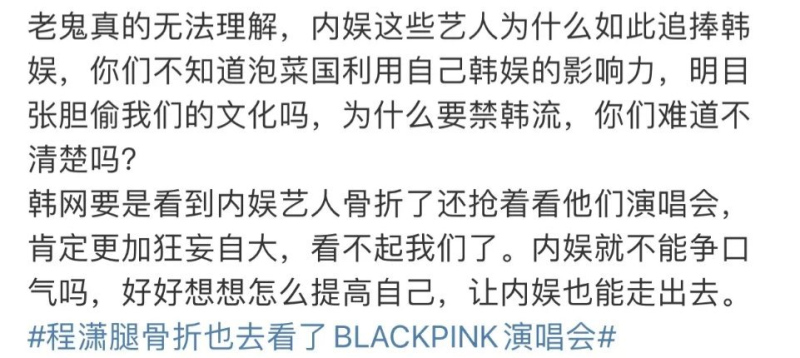 女爱豆程潇更是重量级,号称腿骨折了也要去参加BLACKPINK的演唱会,还买了条热搜宣传自己的如此“努力”。