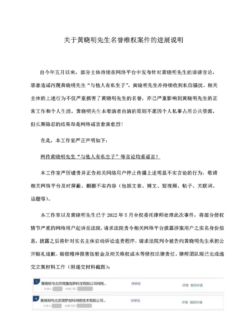 黄晓明的工作室发文表示早在5月份时就有网友在网络上散布相关诽谤言论,这样的行为严重损害了黄晓明的名誉,也对其生活和工作造成了影响。为了维护自己的权益,黄晓明拿起法律的武器对造谣者进行起诉,并会持续关注网络,坚持取证。