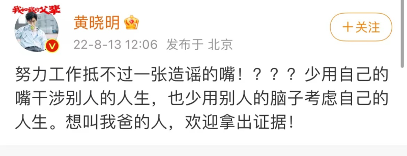 黄晓明也转发工作室的动态,并霸气地表示“努力工作抵不过一张造谣的嘴!想叫我爸的人,欢迎拿出证据”。能够将一向好脾气的黄教主“逼”到公开发火,可见他对此事很是在意。