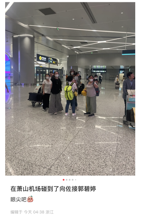 5月26日凌晨,有网友晒出在杭州萧山机场偶遇向佐与郭碧婷的照片,从晒出的照片来看,夫妻两人带着两个孩子,向佐抱着女儿小奶皇,儿子则由一同随行的保姆亲自照料,可以看出此次出行一家人比较“兴师动众”,一共有三个保姆、一个助理一同跟随服务。