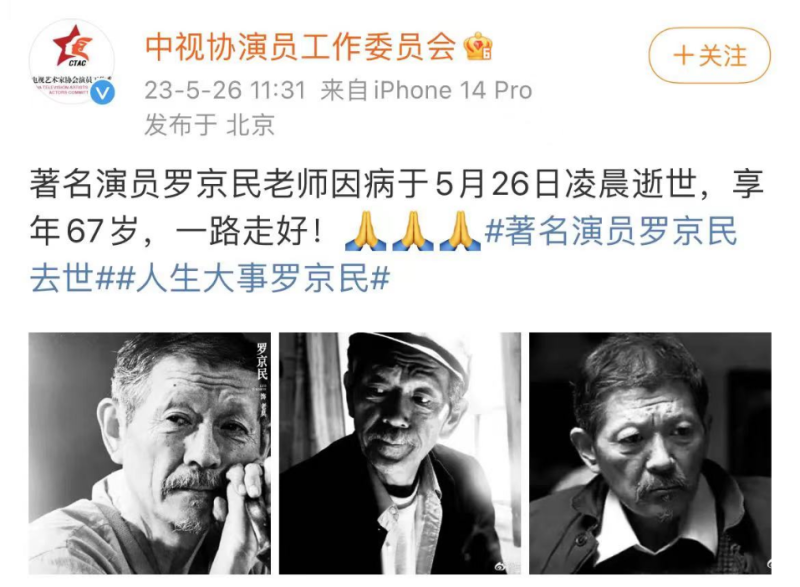 5月26日,演艺圈突传噩耗,知名演员罗京民凌晨在西安因病去世,享年67岁。不少网友得知消息后,纷纷表示难以置信,不忍接受这个惨痛的噩耗。