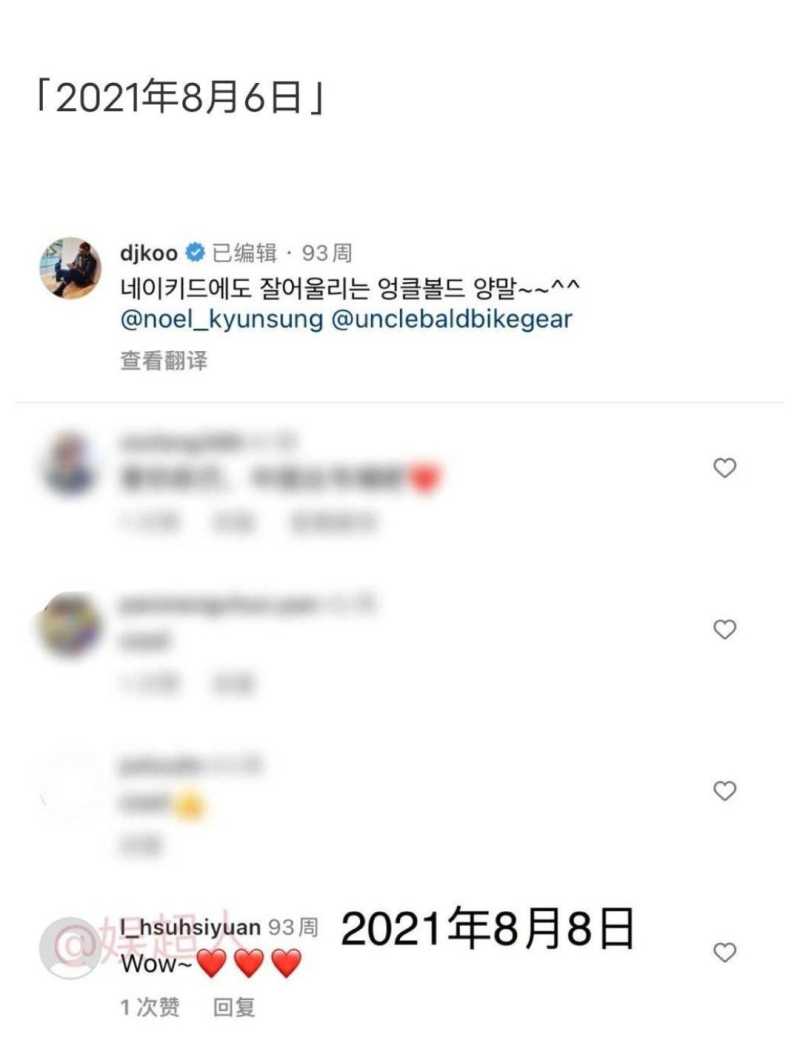 也就是这个小号,在2021年的7月22日的时候,给韩国男明星具俊晔留言评论过一个小爱心,在8月2日的时候,同样给具俊晔留言了一个小红心,甚至在8月6日的时候,还留言了几个眼里是小桃心的崇拜表情。