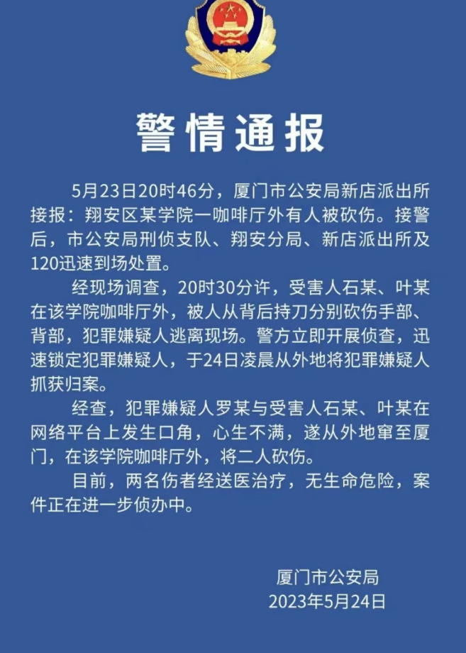 据悉,犯罪嫌疑人罗某此前疑与叶建安有矛盾,两人在网络平台曾发生过口角,为此怀恨心生歹意,特意来到厦门作案,结果误砍伤石佳明,事后犯罪嫌疑人还跑到叶建安的账号下留言,问他为什么跑,可见犯罪嫌疑人的目标是叶建安,并非石佳明。