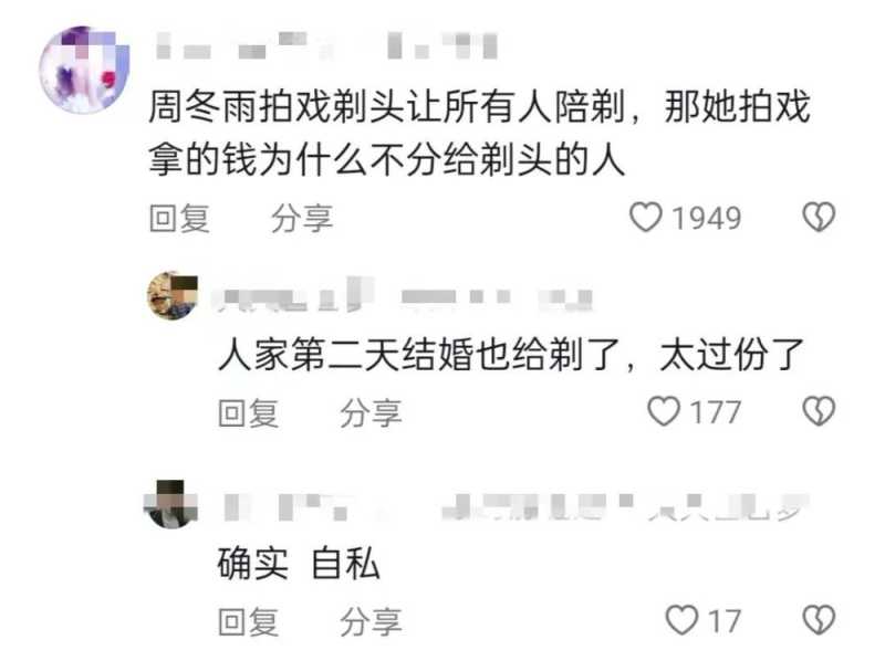 而那时,剧组有个工作人员本来要结婚了,迫于无奈,只好也跟着剃头,经过此次事件,周冬雨的路人缘可谓是彻底崩盘,每次有她的动态,评论区都在吐槽。