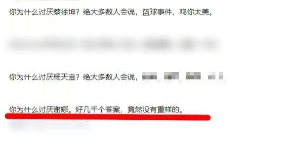 在某个软件上,有人提问,为什么不喜欢蔡徐坤,回答都是“篮球梗”,为什么对杨颖无感,答案基本一致,因为演技不好。而说起谢娜,回答却有很多,理由都不一样。