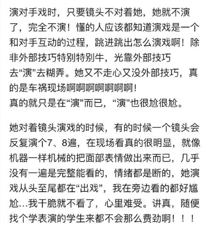 有群演曝料,杨幂在演对手戏时,只要镜头不对着她,她就不演了。这种“不连贯”的演戏方式根本无法让演员入戏,所以演出来的东西也是很“尬”的。
