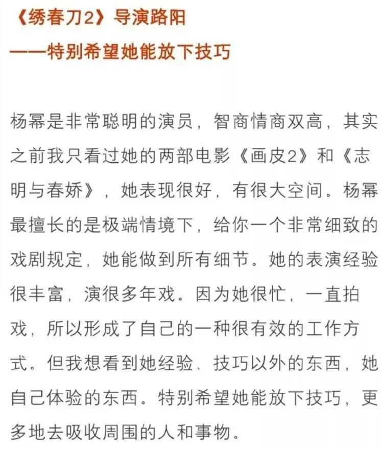 但事实证明,娱乐圈抛弃你的时候,并不会给你很多准备的时间。在杨幂拍《绣春刀2》的时候,导演路阳一针见血指出了杨幂的问题,他说杨幂是一位情商和智商都很高的演员,但她拍戏太忙了,习惯于用最高的效率去拍戏,希望她演戏的时候可以少一点技巧,多一点体验生活。