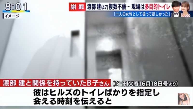 B女士说跟渡部建偷情就跟偷地雷一样,“渡部建很小心,跟她说是朋友的家。玄关的地方放着年轻女士穿的高跟鞋,刚进入玄关右手边的卧室,渡部建就开始猴急的脱衣服。