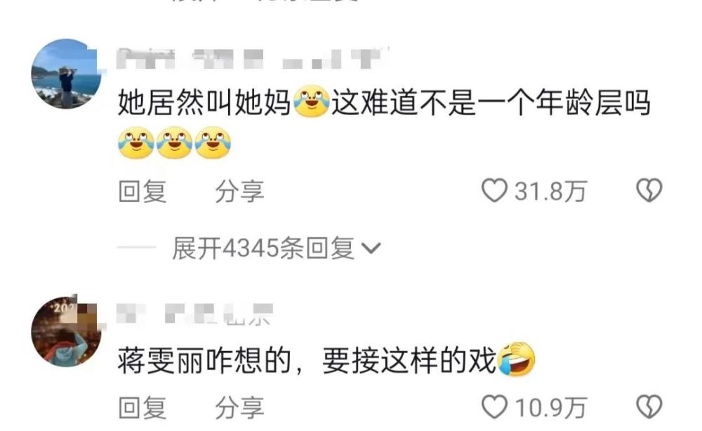 离谱的是,这个剧里面,扮演蒋雯丽母亲的演员朱茵,现实中只比她大8岁,两人同框,视觉上看着就是同龄人,但是蒋雯丽喊她妈,这也太出戏了。