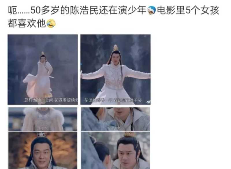 继续说回他扮嫩的话题,影片里面他的设定是个少年,台词用少爷、小生等词语来形容他。但是配上陈浩民这张脸,显然不合适。他的抬头纹和法令纹一目了然,皮肤松弛,让人出戏。