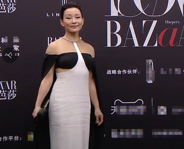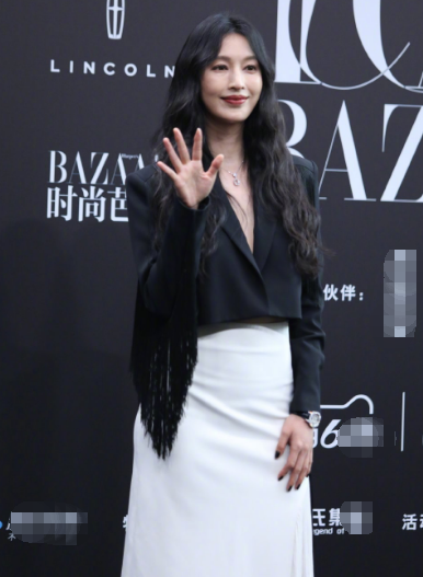 张俪一身黑白套裙简单利落,加上一头大波浪长发,很适合张俪本身的个人风格。
