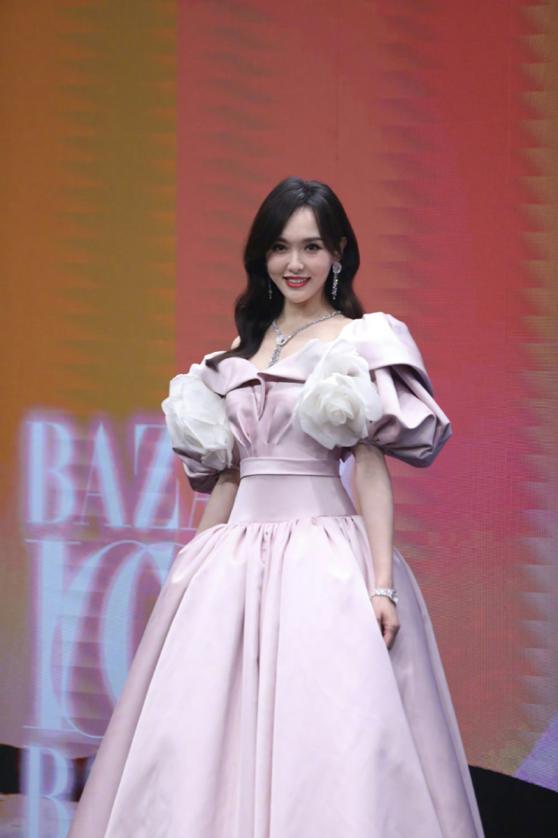 唐嫣则是一袭粉色泡泡袖公主裙,梦幻甜美,很符合唐嫣“甜妹”的形象。