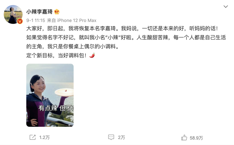 争论后辣目洋子把名字改回了本名“李嘉琪”,总觉得有重新来过的意思。