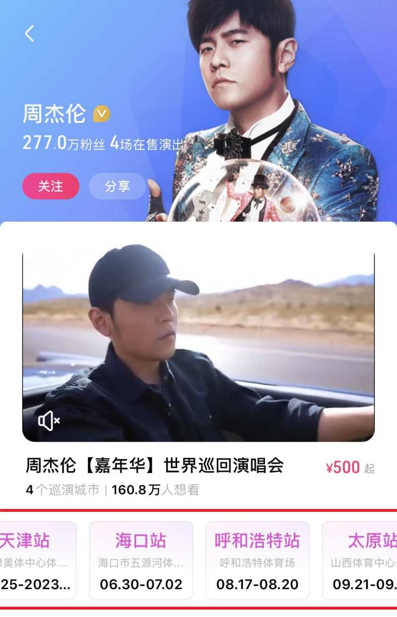 周杰伦演唱会门票没有便宜过。无论天津、海口、太原还是呼和浩特,通通一刀切:最低500、最高2000;内场1000起。