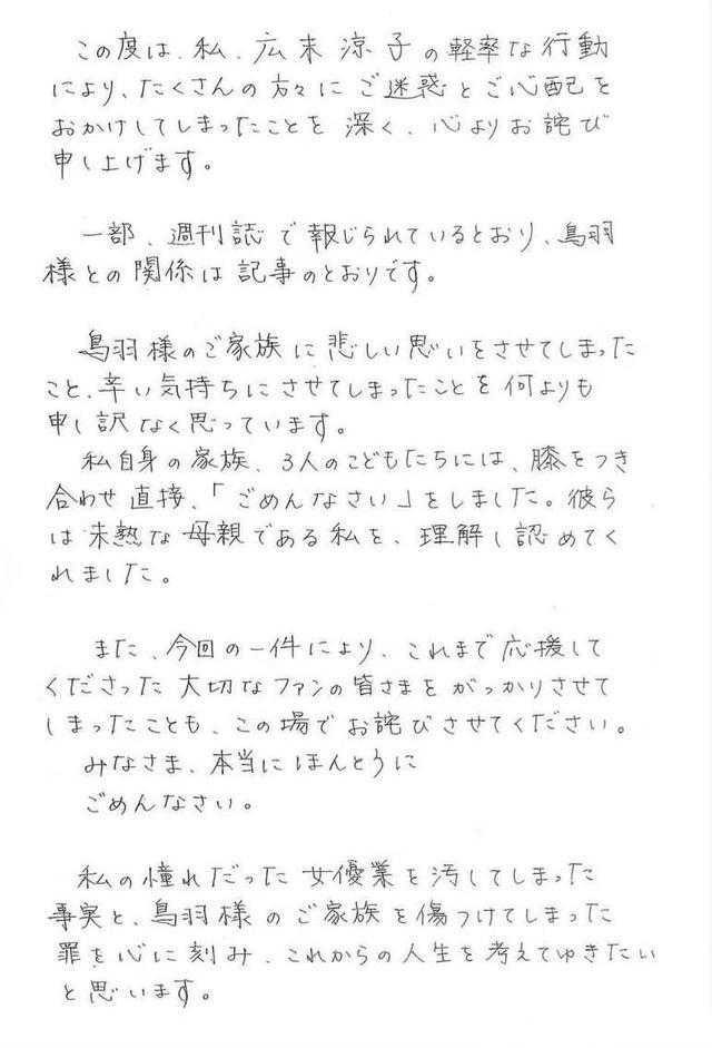 广末凉子在Instagram上发表了一份声明,坦承与鸟羽周作有婚外情,并对给许多人带来困扰和担忧表示歉意。她向鸟羽周作的家人道歉,并为给他们带来的伤心和痛苦感到非常抱歉。她向自己的家人诚实地说明了这件事,并得到了他们的理解和原谅。