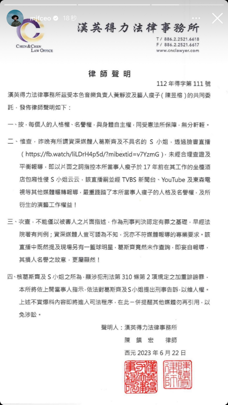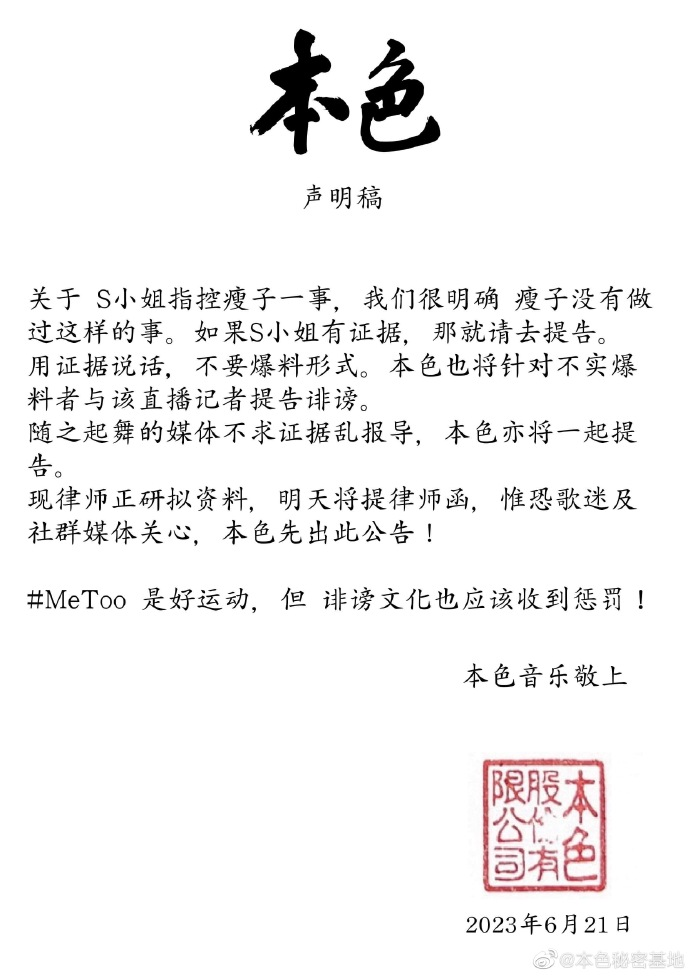 对于整件事情的始作俑者——葛斯齐和爆料人,瘦子的经纪公司一句废话也没有,直接甩出了律师函。