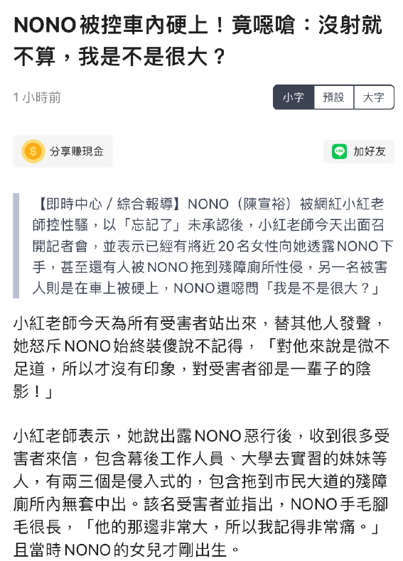 同样被爆出是性骚扰惯犯的还有台湾艺人NONO,更令人震惊的是,这次的受害人竟然高达20个。