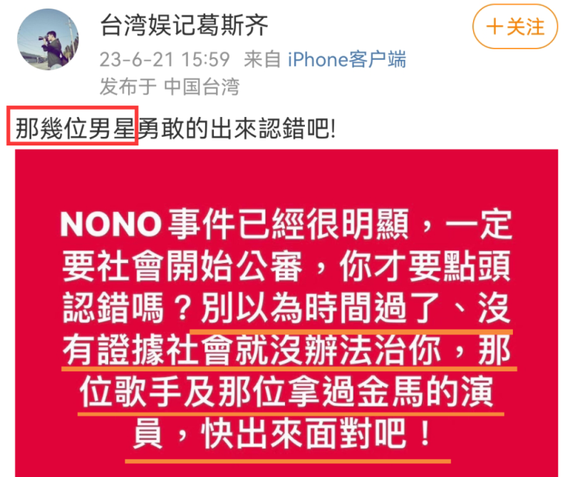 借着NONO事件的热度,葛斯齐开始为自己的爆料积攒人气了,先是喊话:几位男星站出来认错。