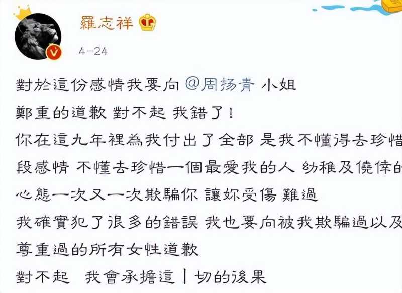 早些日子,周扬青曝光与罗志祥分手内幕,“多人运动”也成为罗志祥身上挥之不去的黑历史。