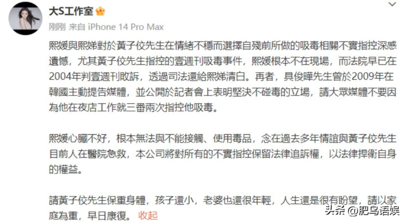 其实娱乐圈的烂人有很多,黄子佼又是主持人,基本上形形色色的信息都是了如指掌的,之所以爆料这些人,也是有宿怨在里面。就像是黄子佼发文称:自己吸毒是受到大小S等这群人的邀请,而且具俊晔还在浴室里逼他嗑药。言外之意如果没有这群狐朋狗友,黄子佼觉得自己也不会走到自杀这一步。再联系到大S连吃饭上厕所都要躺着,让具俊晔伺候,这就不由得让网友联想到黄子佼的爆料。但是大S工作室还是一如既往否认到底,还在文末喊话黄子佼老婆孩子都年轻,要以家庭为重,网友都读出来赤裸裸的要挟。