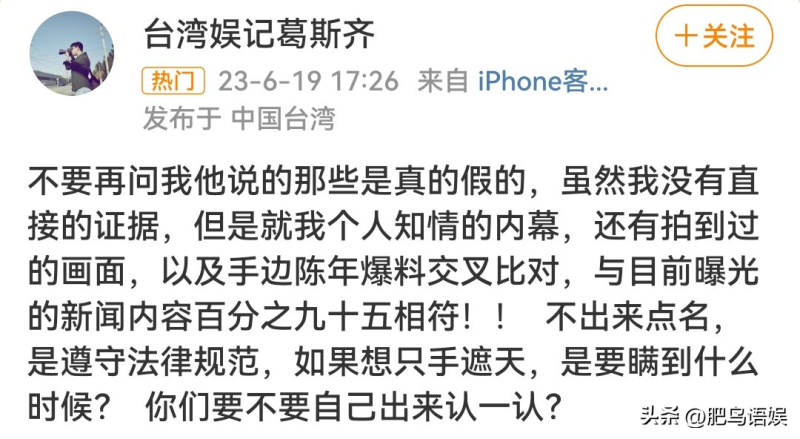黄子佼文中提到的大小S,范晓萱,阿雅,周俊伟,具俊晔,吴宗宪,曾国城等8人,都陆陆续续排队出来否认。当然,已经没有人在乎这些人如何花式否认了,因为原本站在大S这一边的娱记葛斯齐,出来盖章认证黄子佼说的95%的内容都是真的。