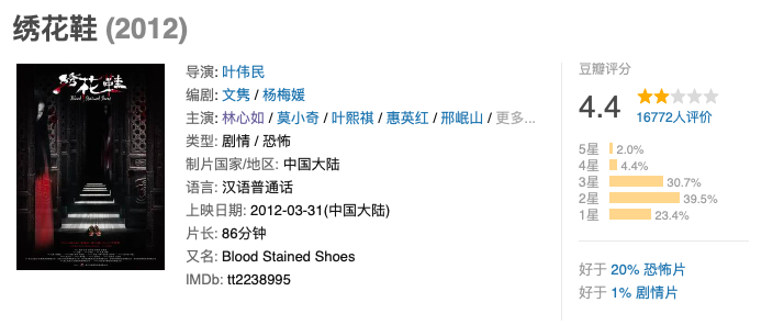 一改过去甜美的形象,她出演了恐怖片《京城81号》《楼》《绣花鞋》,可惜口碑都不到及格线。