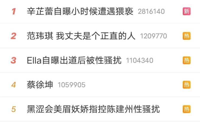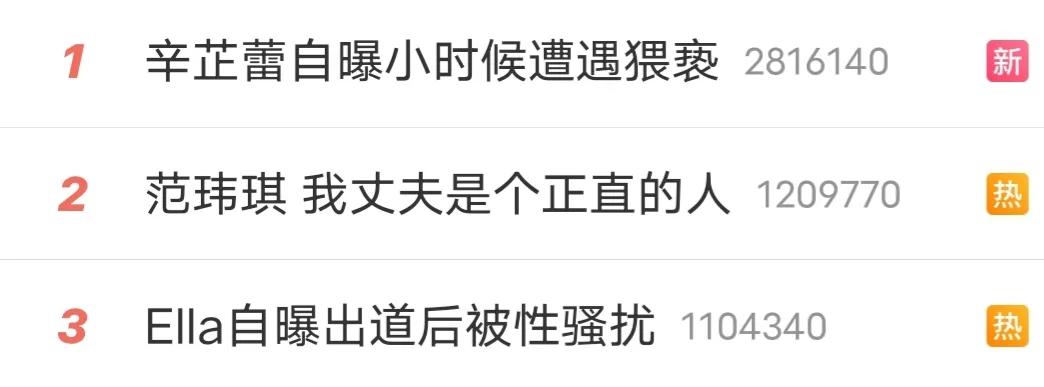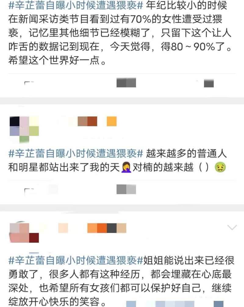 而今日接连又爆了两个热搜,歌手Ella以及演员辛芷蕾都发文曾遭遇过猥亵和骚扰。