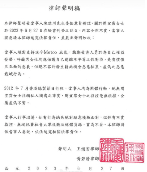 黄韵玲表示,陈建州曾在工作过程中多次对她进行不恰当的言语挑逗,甚至试图进行物理接触。其他几位艺人也有类似的指控。 这六位艺人的爆料,让公众对陈建州产生了更深的疑虑。许多人开始质疑,陈建州的经纪公司是不是一个令人心寒的环境,是否存在着一个长期的、结构性的性骚扰问题。这些指控也让公众对他的形象有了更大的质疑,他的名声受到了前所未有的打击。 对于这些指控,陈建州坚决否认。他的经纪公司也表示,这些言论都是误导公众的错误陈述,他们将采取法律手段追究诽谤者的责任。