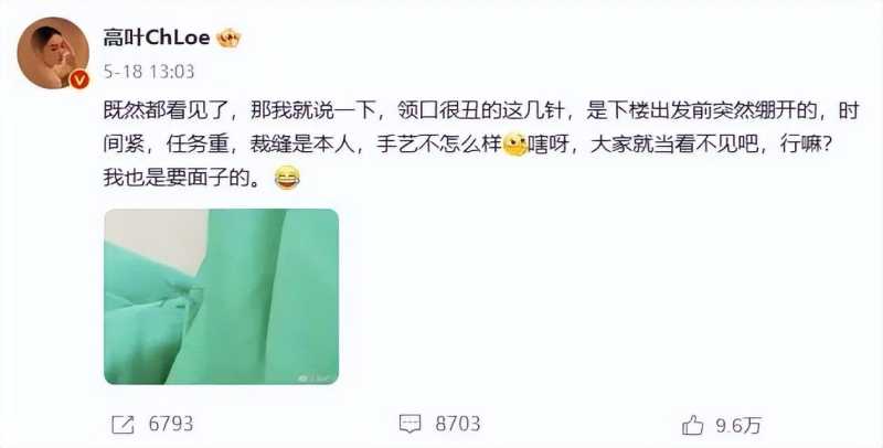 事后,她坦率承认:“既然都看见了,那我就说一下,领口的那几针,是下楼出发前绷开的,时间紧,任务重,裁缝是本人,手艺不怎么样”。