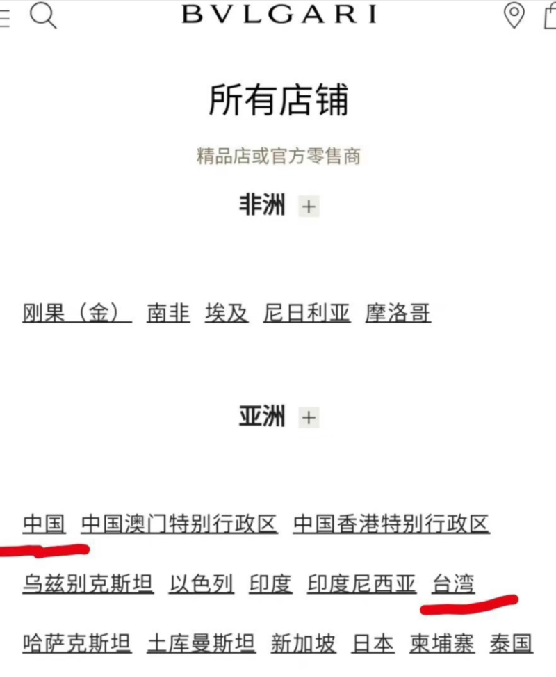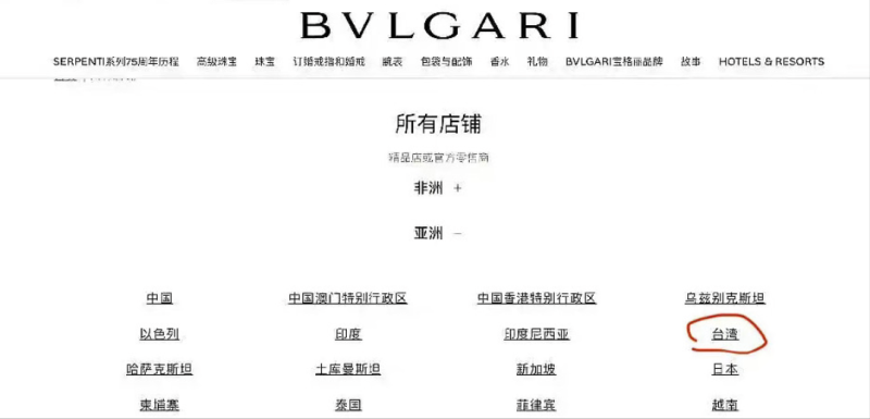 前段时间购买宝格丽的网友突然发现,该品牌在进行地区国家分类时,居然直接将中国与台湾并排,但却在澳门和香港前面加上了中国特别行政区的标识,不少网友见状纷纷表示,难道在台湾前面加上中国二字很费劲吗?