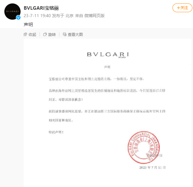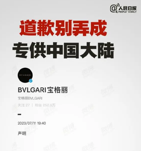 面对宝格丽品牌如此明目张胆侮辱中国的行为,网友们自然是坐不住了,随即强烈要求对方道歉。而宝格丽官方见状,赶紧发表声明,表示自己尊重中国领土完整。