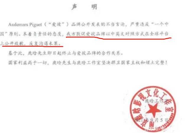 而这件事到这里还不算完,在发现对方发布的道歉声明如此敷衍,连个公章都没有的时候,他更是直接要求对方用中英文对照方式,在全球全平台向中国道歉!