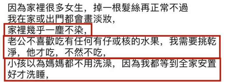 不过,她并没有收回对老公的“控诉”,而是继续表示,“大家以为嫁入豪门就是舒舒服服当贵妇……我从小也是在家当个小公主,但为人母之后,就更需要认真学习当个称职的太太及母亲、照顾家庭每个人。”