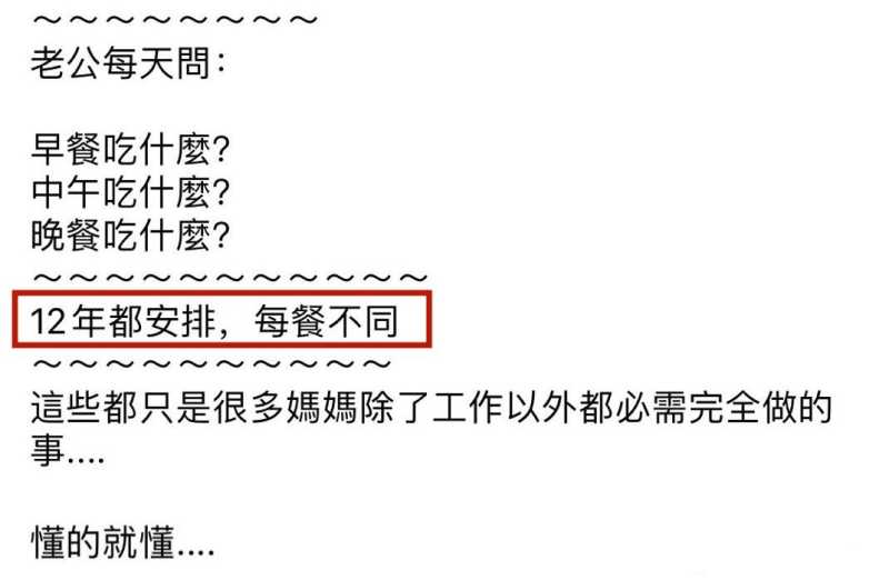 于是在结婚的12年里,她每天每餐都要做不同的安排,尽量保证对方能吃到不重样的餐品。
