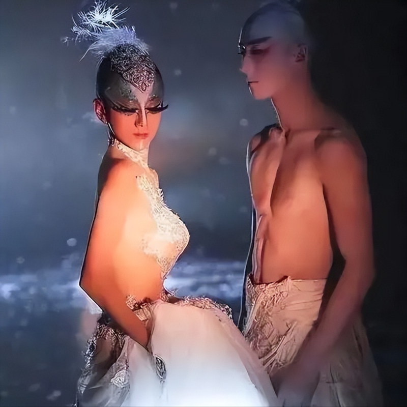 在这样的设定之下,男舞者肯定就失去了羽毛,也就决定了在造型设计上要向“赤裸”靠拢。