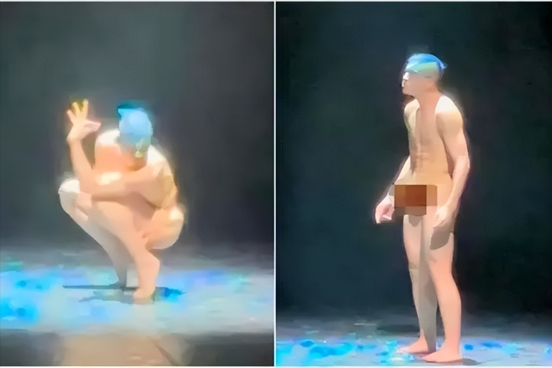 从网上流传的照片来看,台上表演的男舞者全身应该只穿着一条肤色打底裤。