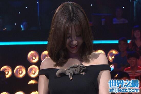 而在柳岩下腰结束后,还展示了自己的小萌宠马里奥,是一种蜜袋鼯,舞台的嘈杂让小蜜袋鼯有点不适应,柳岩十分温柔的安慰它,“马里奥,你不要害怕,我不会吃了你的。”接过这只小宠后,柳岩更是把它放在了胸口,并凭借傲人上围完全托住,让人不得不佩服柳岩的胸真的太大了。
