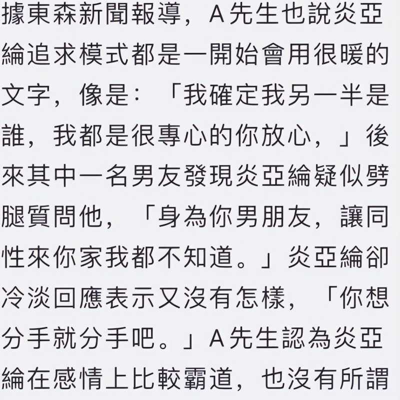 A先生说,炎亚纶交往对象大多是年轻弟弟,在追求人之前都会用很暧昧的文字:“我确定我另一半是谁,我都是很专心的你放心。”