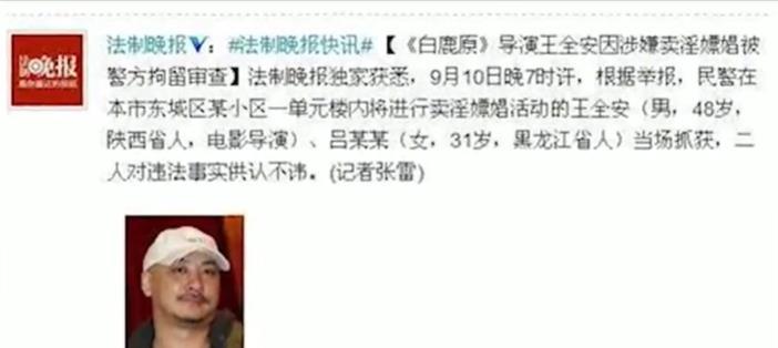 2014年9月15日,北京警方宣布,《白鹿原》所长王全安因涉嫌跟踪卖淫罪被逮捕。随后他被判处1年监禁。