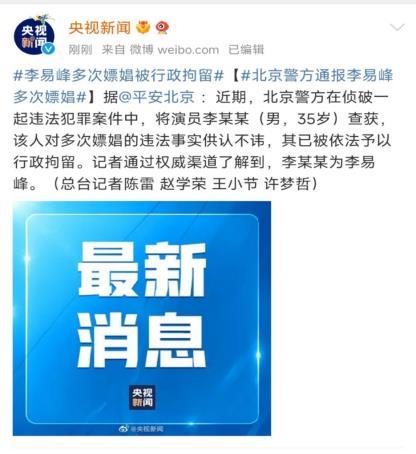 但就在大家等待微博官方消息的时候,北京警方居然发布了李易峰因跟踪妓女被捕的公告,一举成为微博热搜第一。