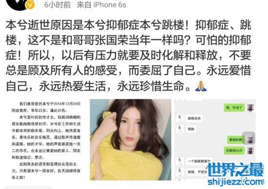 而多年前受尽万千宠爱的哥哥张国荣为什么自杀也同样是因为抑郁症!但是本兮也是因为抑郁症跳楼自杀而死吗?没有人知道,也没有人证实,只剩下各种猜测……毕竟在之前也完全看不出本兮的身体有什么不健康的样子啊。