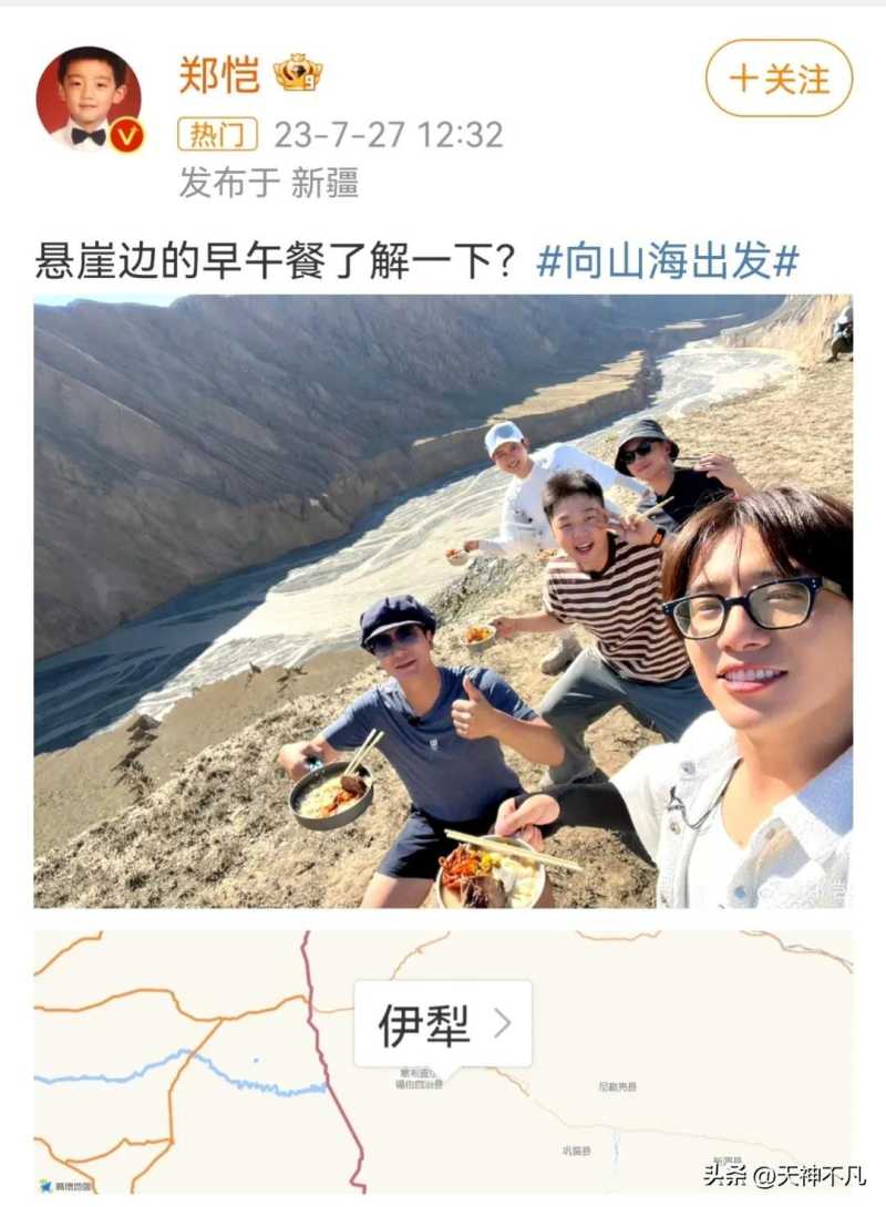 就在今天,郑恺更新个人动态,他的IP地址显示,他现在在新疆,照片中,他和杜海涛等人一起出现在画面中。他们几个在山顶在吃饭,这是郑恺在录制的一档综艺节目。他戴着黑色帽子,戴着眼镜,和杜海涛等人摆出造型一起合影。