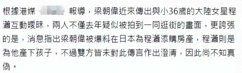 一向保持低调性格的梁朝伟突然被曝出大瓜,台媒爆料梁朝伟和小36岁的女星程潇产生感情,还爆料其为梁朝伟生下一子,梁朝伟为其在日本购置豪宅的新闻,网友看后表示难以相信。