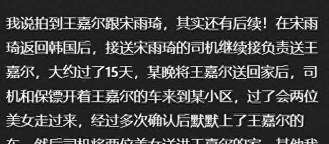 狗仔队爆料,宋雨绮回到韩国后,接他的专职司机就负责接王嘉尔。随后,司机又接两位美女到王嘉尔家,绯闻于是传开。